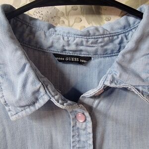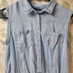 Stylish light blue mini dress with ruffled hem. Features button-up front and chest pockets. Ideal for casual outings.