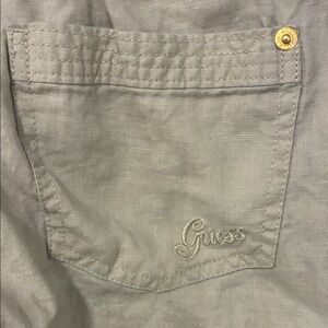 Stylish light tan pants with drawstring. Perfect for casual outings or resort wear! Waist 17”, rise 9”, length 31”.