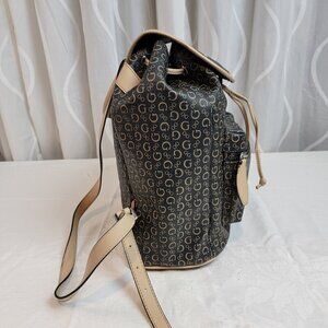 Guess nameplate on the outside with tan G logo on brown background. Tan drawstring closure at the opening and magnetic snap closure for the flap.
