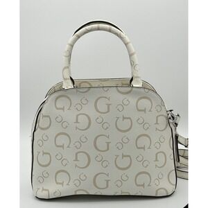 This Guess logo handbag is a stylish accessory for women, featuring a zip closure and double white handles. The exterior is made of faux leather with a natural white color, while the hardware is silver. It also comes with a crossbody strap for added versatility. The brown lining adds a touch of contrast to the overall design, making it a fashionable and practical choice for any outfit or occasion.