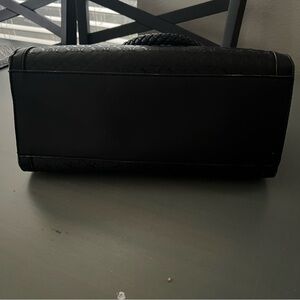 This sleek Guess satchel in classic black is crafted from a textured leather-like material, featuring a structured design with dual top handles. The bag's monochromatic elegance is enhanced by silver-toned hardware and the iconic Guess logo prominently displayed on the front, making it a stylish choice for any occasion.