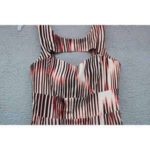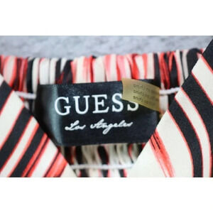 This is a very dramatic and well made Guess Los Angeles Dress that is Ivory with black & red stripes. It has a zipper in the side. Laying flat, it measures: Armpit to armpit-14.25" and it is 35" in length. It is a size 2. It has a stretchy smocked panel in the back for comfort. It is lined. It is 100% Polyester. In great condition.