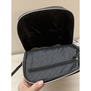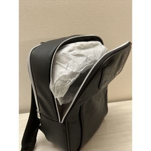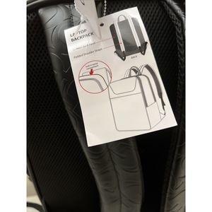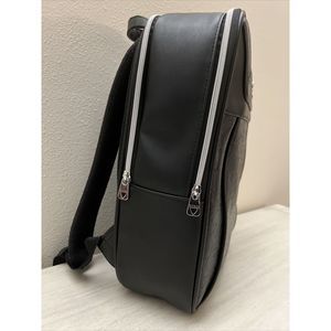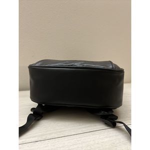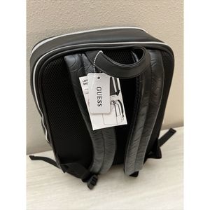 The bag is made of PU leather and has a black exterior and lining color. It has a zip closure and measures 12 inches in width, 16 inches in height, and 5 inches in depth. The black handle/strap color and accents complement the design well. This backpack is brand new with tags and comes from the Guess Los Angeles product line, priced at $265.