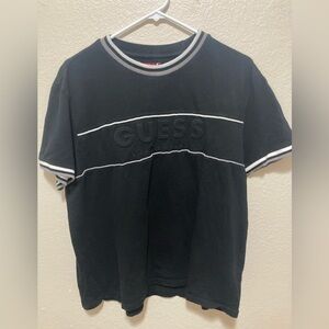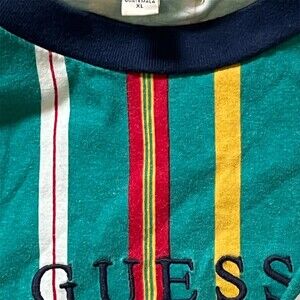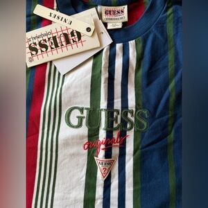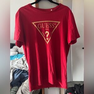 Classic short sleeve crewneck t-shirt from Guess Los Angeles in a vibrant red. This 100% cotton tee features a bold, multi-textured puff print graphic on the chest with "GUESS LOS ANGELES LXXXI" in a mix of black and white lettering. The soft, breathable fabric and standard fit make it a versatile staple for casual wear. Authentic Guess branding is visible on the inner neck and side seam tags.