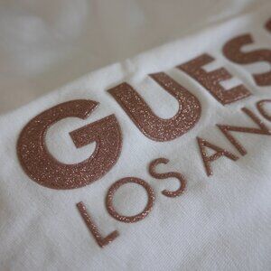 -"Guess Los Angeles" on bottom left leg in rose gold glitter raised (awesome texture)