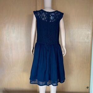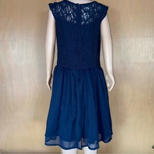 Your little girl will look enchanting in this lacy, blue dress, fully lined and ready for partying. Size medium 10/12.