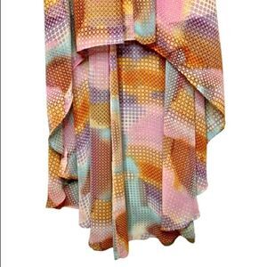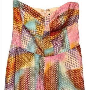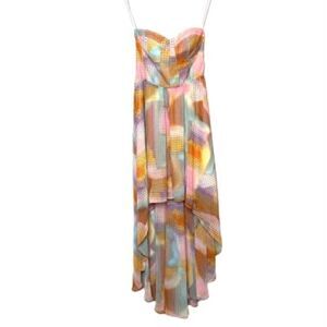 Guess Los Angeles peach, orange, blue and pink strapless high low dress size 2. Style w32gdemp599. 100% polyester. Lined in peach. Lightweight. Top has silicone strip to keep in place with 2 elastic panels and boning for better fit. EUC. Length from center of bust to front hem 26” and to back hem 49” Chest 14” waist 12.5”.