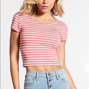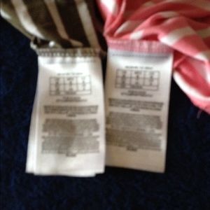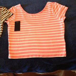 Tow medium sizes, white striped crop top one is pink and the other is olive green, scooped back and front however back is more revealing than front very comfortable and smooth material soft to the touch!