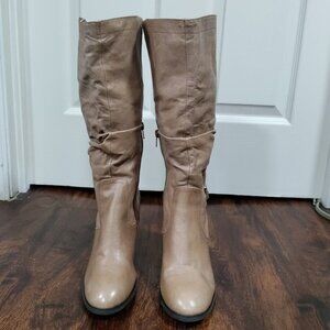 Elevate your style effortlessly with these chic taupe knee-high boots. Perfectly crafted with a comfortable chunky heel, they pair beautifully with dresses or jeans.