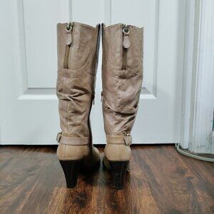 Guess MALLAY Tan Leather Side Zipper Mid-Calf Chunky High Heeled Boots Size 9M, Some scuffs and creases visible.