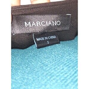 Marciano is a brand known for its figure-flattering designs and use of draping techniques. This dress features a round neckline, cap sleeves, and a draped effect at the hip, creating an asymmetrical hemline. The fabric is a soft, stretchy jersey material, which is common in Marciano dresses for comfort and fit. The dress highlights the wearer's shape and the dress' design details.