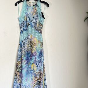 Guess Marciano Long Maxi Dress Blue Leopard Chiffon Lace Designer 42 US M Italy Sleeveless Fairy whimsical New