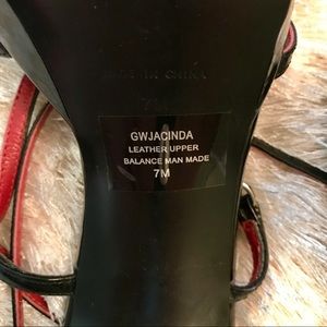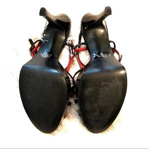 Real leather strappy stilettos feature a shiny patent heel and red accent sole. Adjustable wrap around ankle strap closure. Heel height measures 4.5" and front platform measures 1". Minimal wear. Minor nicks around heel (hard to photograph but tried to show in last photo) Despite the look, they are extremely comfortable!