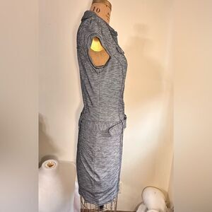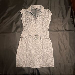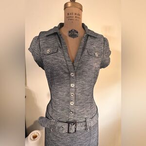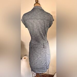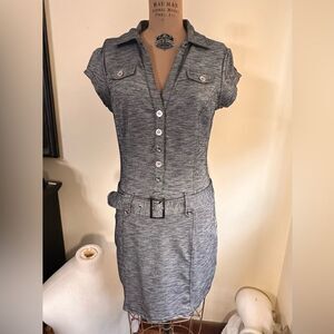 Guess Marl Gray Short Sleeve V neck button down Mini Dress size Large. Polyester cotton blend with a little spandex for great stretch. Semi body contouring fit with belt detail and functioning buttons down to waist, faux chest pockets . In excellent condition .