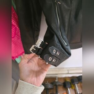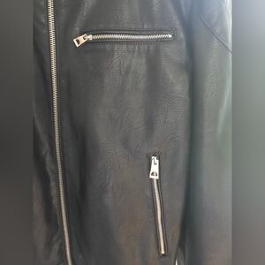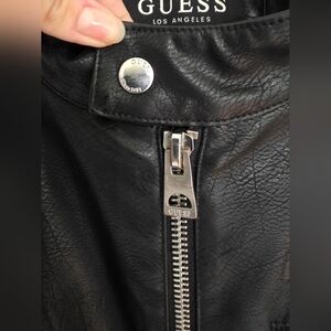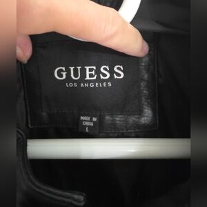 guess mens faux leather (polyurethane) jacket. Heavy weight/ looks and feels like leather. silver colored hardware, three outer zip pockets. two interior slip pockets. snap collar. mens large. one small spot (shown in pictures) down near hem close to zipper, not noticeable