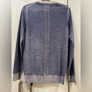 Stand out in this fashion-forward V-neck cardigan by Guess, featuring a unique blue-gray color with purple undertones and a gradient dyed effect that lightens at the hem and cuffs. Finished with metal buttons and a signature metal Guess emblem near the hem. Made from a soft acrylic-wool blend. Men’s size Small. Great preowned condition — no holes, minimal signs of wear.