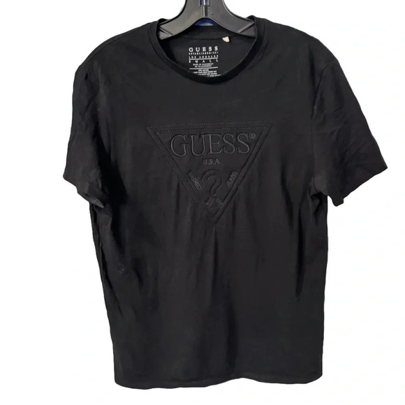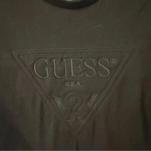 Excellent condition. Men’s Guess tee shirt. Black, short sleeves, quilted embossed logo. Size small. See photos for measurements