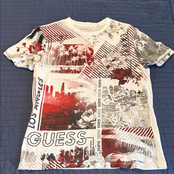 Stylish Guess tee with bold graphics. Features red, black, and white design. Perfect for casual wear.