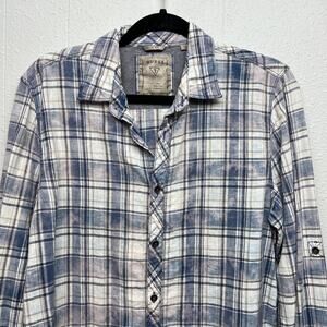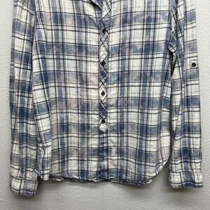 Guess men's plaid shirt in tie dye blue & white. Collared. V-neck. Button down. Long roll tab sleeves. Slim fit. In good used condition. No stains, tears or holes.