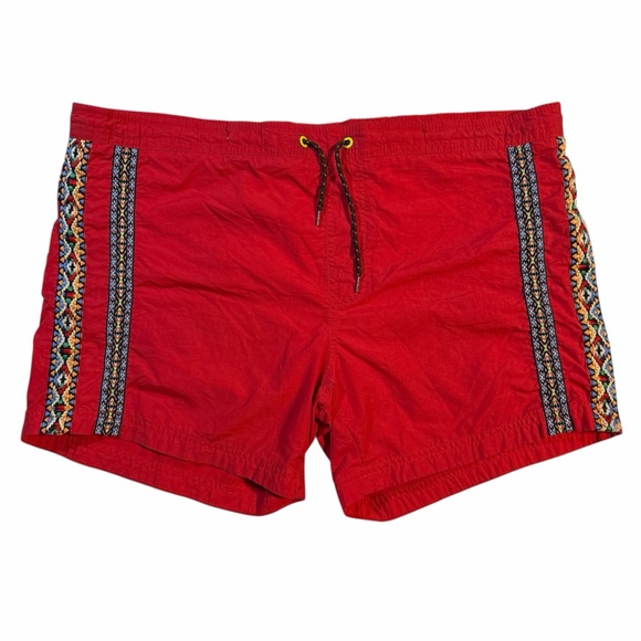 Guess Men's Red Athletic Swim Shorts with Patterned Stripes Large