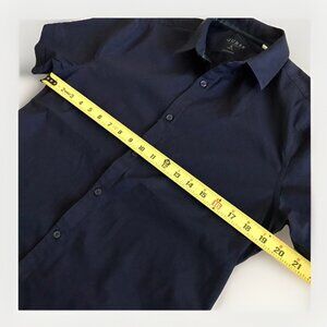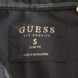 The product is a Guess Men's Solid Button Down shirt in blue, size small. This slim fit shirt features short sleeves and a front button closure, making it a stylish and versatile addition to any man's wardrobe. Made of 100% cotton, this shirt is designed for comfort and durability.