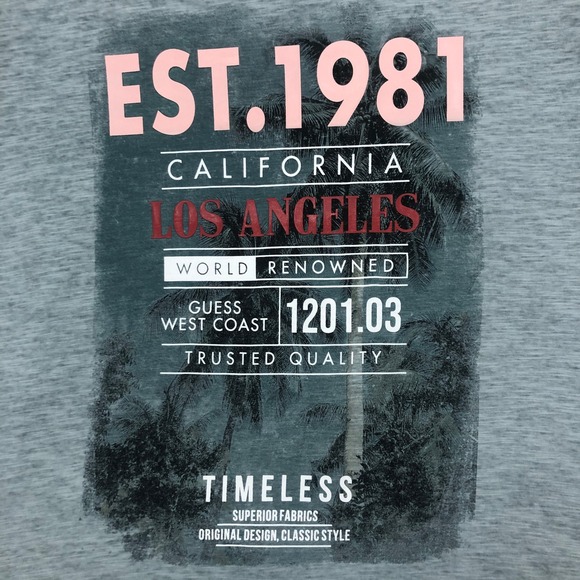 Keywords: Guess T-shirt, Mens T-shirt, Graphic Tee, California T-shirt, Los Angeles T-shirt, XL T-shirt, Extra Large T-shirt, Gray T-shirt, Casual T-shirt, Crew Neck T-shirt, Short Sleeve T-shirt, West Coast Style, Vintage Style, Retro T-shirt, Guess Est 1981