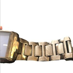 Guess sophisticated watch. Shining steel bracelet band. Square face measures 1" X 2". A shimmering navy blue face finishes the sleek look. Silver hands. Rhinestone marker at 12. Sport clasp closure. 50m/ 165 ft water resistant Stainless steel back Japanese