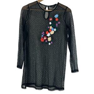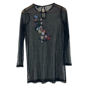 Guess Mesh Tunic Top Womens S Black Sheer Floral Embroidered Whimsigoth Dainty
