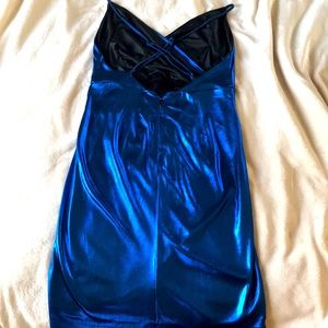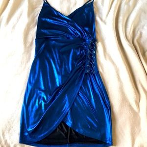 Show-stealing cobalt blue metallic mini with lace up detail and side ruching. Figure flattering faux wrap style. Fully lined. Adjusting straps! No tags but never worn.