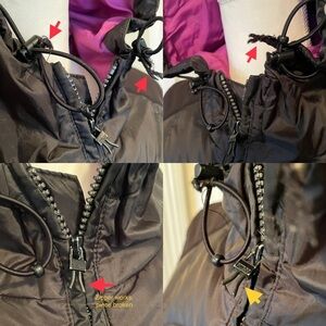 Pre-owned Guess Mid-Length Black Hooded Winter Zip-Up Jacket. Women’s size medium. 100% Polyester and 100% Nylon. Zipper side pockets and velcro interior pocket. Adjustable hood tabs work, but have some fraying. Purple lined interior. Zipper works, but metal zip piece is broken. Some markings on interior collar. Still in good condition. See all photos.