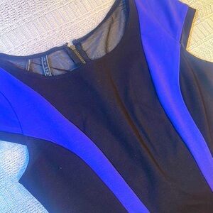 This stunning Guess dress features a captivating black and blue color-block design, perfect for a cocktail night out. The off-the-shoulder neckline and cap sleeves add a touch of elegance, while the sheath style ensures a flattering fit. Its mini length and structured fabric make it a chic choice for buisness attire or evening occasion.