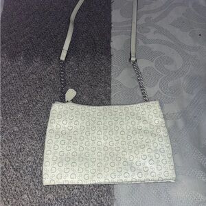 Elegant Guess crossbody bag in cream. Features signature logo pattern. Perfect for daily use.