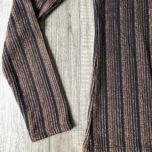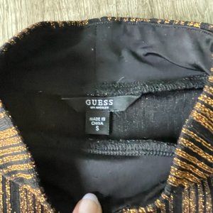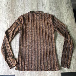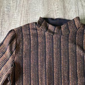 Size Small Guess top, long sleeves with stretch and GLAM! Copper orange shimmer meets black stripes on this unique top. Small mock turtleneck at neck line and slightly fitted with room for various body types.