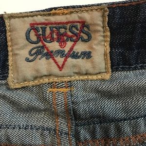 ✨SALE✨Nice Guess jeans with a straighter leg, Medium wash with the lighter front legs and silver accented front and back pockets...size 24 they measure about 14.5" across waist laying flat with a nice long 33" inseam and a rise of about 6" maybe a tad more, leg opening is 7.5" they are cute rugged and distressed some along cuffs(see pic 6) offers welcome bundle to save more plus ⚡️📦📫😃💕normally $39