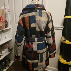 Polyester wool blend. Stored in smoke free, No Tag, Not worn, In closet. A very fun and beautiful cost. Stay warm cozy and stylish!