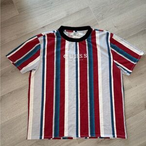Vibrant tee with bold stripes. Features Guess logo on front.