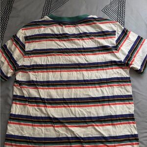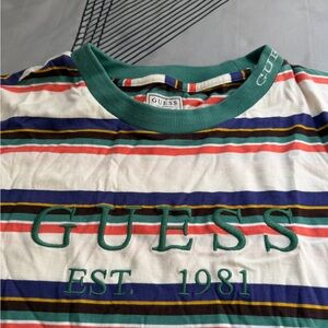Vibrant tee with multicolor stripes and Guess logo. Features red, blue, green, and white. It fits bigger than a small