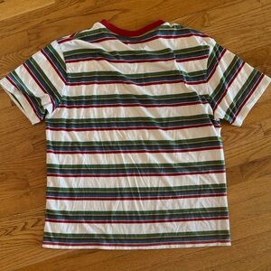 Vibrant striped tee with red neckline. Embroidered Guess logo on front. small marks through out shirt- see all photos