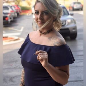 This navy blue dress by Guess showcases a striking off-the-shoulder neckline with ruffled accents. The bodycon silhouette and sleeveless design offer a sleek and modern look, perfect for making a statement at any cocktail event. Only worn once for a wedding, as shown in pictures.