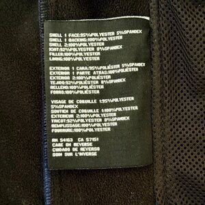 -Shell: water-resistant material, 95% Polyester, 5% Spandex.