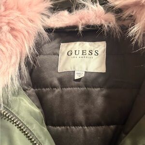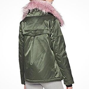 Chic Guess jacket featuring a pink fur hood. Olive exterior with a cozy design. GUESS Women's Joy Faux Fur Collar Jacket, Olive Multi, Size M
