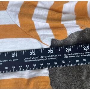 Classic Guess Originals T-shirt featuring orange and white horizontal stripes. Made from comfortable fabric with a crew neckline. Embroidered Guess logo on the front. Size large. Casual and versatile for everyday wear. Retro style.