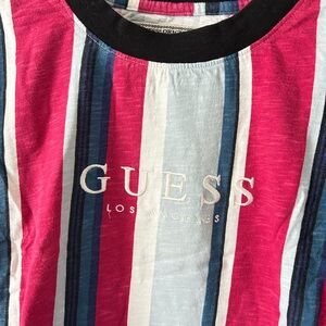 Stylish Guess Originals tee with colorful stripes. Features bold pink, blue, and black accents. Ideal for everyday style. 100% cotton.