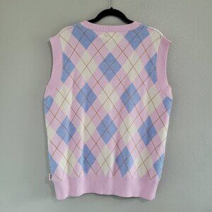 Guess Oversize V-Neck Argyle Vest Soft Pink Blue Knit Academia Preppy