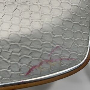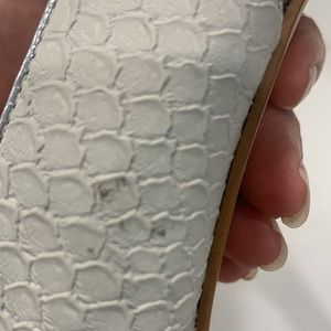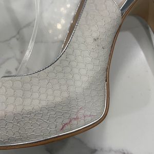 Women’s White Man Made Material Faux Snake Skin Upper Huela2 Peep Toe Sling Back Stilettos. Size 9 Shoe in Great Condition. A few Red Markings on Sides of Shoes shown in pics. All flaws are shown in pics. Gently Pre-Owned Sexy Shoe.