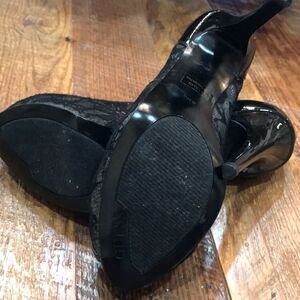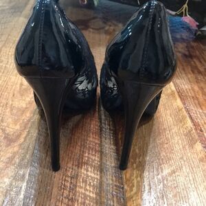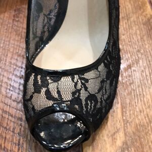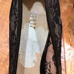 Black lace Guess Heels Lace with peep toe design 5 inch heels Please note flaw inside where label was. Box E