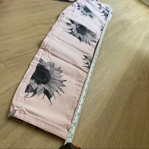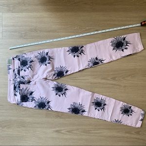 By Guess. Super stretchy low-rise, cropped jeans called the “Kate” legging style. (Ankle length for the petite, cropped for the average to tall. Prettiest baby pink shade with a black and white floral photograph print. I’ve gotten so many compliments with these!