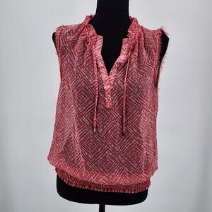 Look your best in this lightweight/sheer sleeveless blouse with stunning details from Guess. Ruffled neck leads to a notched V-Neck with ties. The ties are adorned with silver metal squares at bottom. Sleeves are finished with a frayed edging – such fine pretty detail! 2 inch ruched elastic waist rounds out the details on this gorgeous sleeveless blouse.