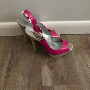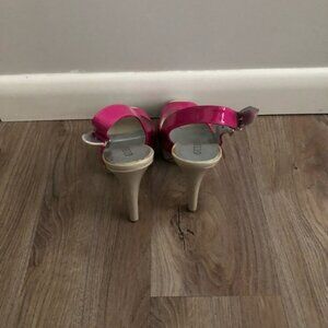 Pink peep toes shoes with cream color buckle size 8. I’ve only worn them a couple of times unfortunately I can’t wear peep toed shoes. They are in excellent condition.