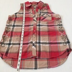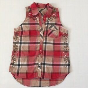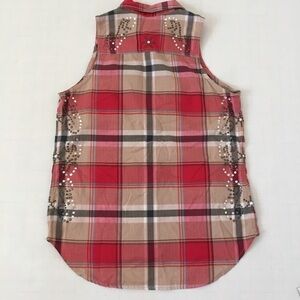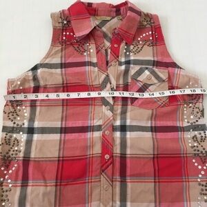 Guess Red Tan Plaid Button Up Sleeveless Western Shirt Ombre Gold Studs